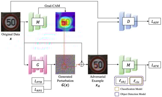 The proposed eSLP-GAN architecture consists of three primary components: a generator G, a discriminator D, and a target model M. The target model M approximates the hypothesis function that performs the classification task or the object detection task mentioned above. Generator G takes the original data x as input and generates a perturbation over the entire region of the input image. In contrast to previous proposals [46], this method employs additional steps to generate spatially localized perturbations for adversarial camouflage patches that can be attached to a specific location.