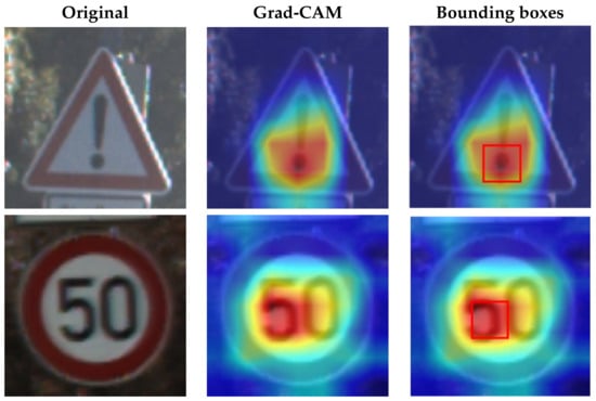 Samples of Grad-CAM visualizations and bounding boxes on traffic signs.