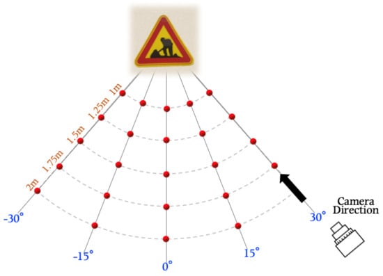 We first took approximately 150 pictures of each traffic sign mock up at varying distances {1, 1.25, 1.5, 1.75, and 2 m} and angles {0°, 15°, 30°, −15°, and −30°}. Figure 3 shows each point at which traffic sign images with different distances and angles were taken. We verified the robustness of the eSLP-GAN under various physical conditions by altering the environmental settings with different distances and angles.