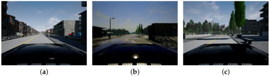 Examples of photo-realistic environments in the CARLA simulator. (a–c) show the capture of some different panoramas and shades in the CARLA simulator.