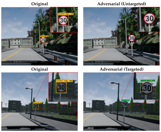 This differs from the attacking loss of the classification model by the addition of the objectness score. In the case of an untargeted attack, the target model considers the bounding box empty of objects by minimizing . In contrast, in the case of a targeted attack, the target model is induced to classify as the target label by minimizing , and the objectness score for the target label is increased by maximizing .