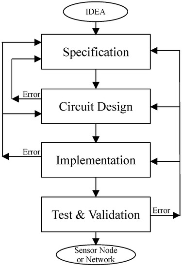 It is well known that the design flow followed to implement a sensor network or node [23] is basically an electronic circuit design methodology [24]. It is not a straightforward task, and it is called design flow cycle. Figure 1 presents a simplified version of the traditional electronic design flow. Finishing the specification of the project idea, its circuits are designed. Then, the proposal is implemented, tested, and validated.