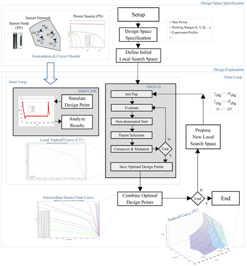 As each sensor network or node approach on the literature has its own design variables, the first step is to determine the design variables. Obviously, this apparently simple step requires good knowledge from the designer because a mistake in the design variable selection will lead to the failure of the methodology. For instance, the example of Section 4.3 defines as a design variable the charging current . In this scenario, the is a variable depending on because, in this example, we cannot control the load value. If we try to define both design parameters as design variables, in this example, the algorithm fails at the inner loop in the simulation stage.