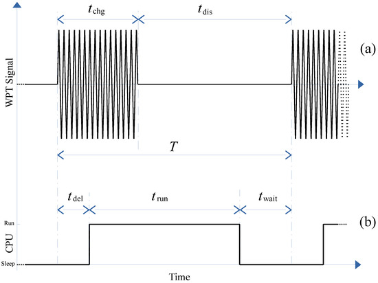 Given an iteration time T, the sensor node receives energy during the first seconds (see Figure 5a). Then, the WPT signal disappears during . In the sensor node side, once the iteration begins and the WPT signal is applied, the CPU of the sensor node requires some delay () to go from the sleep mode to its run one. Then, the programmed measurement is executed during . Finally, the sensor node goes into hibernation waiting for the next iteration.