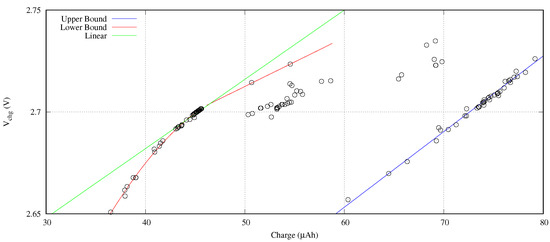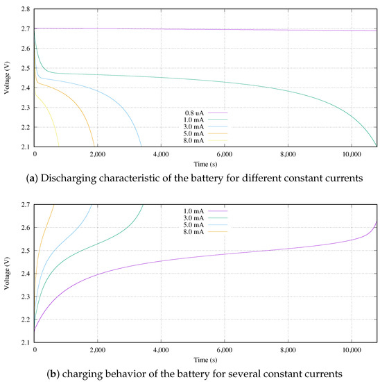 From a practical point of view, in this research, we use the battery model UMAC from Murata Manufacturing Co. Ltd. (Nagaokakyo, Japan). Its main features are detailed in Table 1. We need to take into consideration that, although the usable battery working range is [1.8, 2.7] V, it can be used outside of its margins. However, the 1.8 V voltage can be only reached when the battery is under a specific load. Otherwise, its output voltage is greater than 1.8 V. For example, given a battery at a temperature of 25 ºC, its output voltage is 2.1 V when it is without load (zero current load).