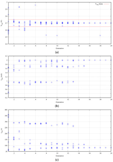 In this experiment, the search range of the design space is 0.2 mA 2.2 mA and 300 s 600 s. Figure 7a represents the convergence of the target voltage to charge . We conclude that our solution requires only seven generations obtaining an error lower than [−7.83, +34.6] mV. Obviously, the higher the number of generations, the greater the convergence. For example, after the fourteenth generation, the voltage deviation is lower than ±4 mV. Certainly, along the evolution, there are multiple individuals that do not meet the error criteria. However, they are necessary because they belong to the crossover and mutation capabilities introduced to avoid local optimum design points in the NSGA-II optimization engine. Despite of their presence at this search level, they are discarded at high level design explorations as was pointed out in practical considerations (Section 4.1).