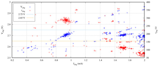 Other open question is to understand the usage of the and D functions (see Equations (14) and (15) for more details). A strict mathematical analysis of the function indicates that it only compares the timed-on with the always-on methodologies. Please remember that those methodologies do not modify the charging current (). Therefore, the value to the right (3 mA) of Figure 10 shows this comparison. For example, given a 10% duty cycle, the timed-on methodology decreases the energy consumption 90% against the always-on methodology.