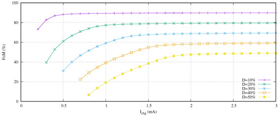 This FoM upper limit is observed in the experiment data shown in Figure 10. For example, the 20% duty cycle curve is close to the 80% value after an equal or greater than 1.5 mA.