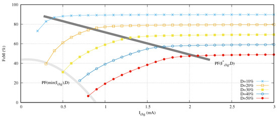 On the other hand, it is shown that the definition of the curves do not fulfill the complete set of possible charging currents. For example, given that D equals to 30%, its minimum charging current is close to 0.5 mA. We must take into consideration that sometimes, although we are working with practical working ranges for and , several combinations of them do not allow for charging the battery. Those limit points define the Pareto Front (PF) curve of the minimum charging current for a duty cycle . As we expect, its behavior shows that the increase of the duty cycle requires less current to charge the battery.
