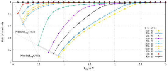Exposing the behavior of the design space for a given T, it is time to modify this value and observe its influence in the FoM. Then, we propose as an experiment to compare the effect of duty cycles of 10% and 50% for different iteration times T from 300 to 1800 s in 300 s steps. Due to the variation of T, in order to evaluate correctly the curves, we need to normalize the time and therefore the FoM. Figure 12 shows the results of experiment proposed.