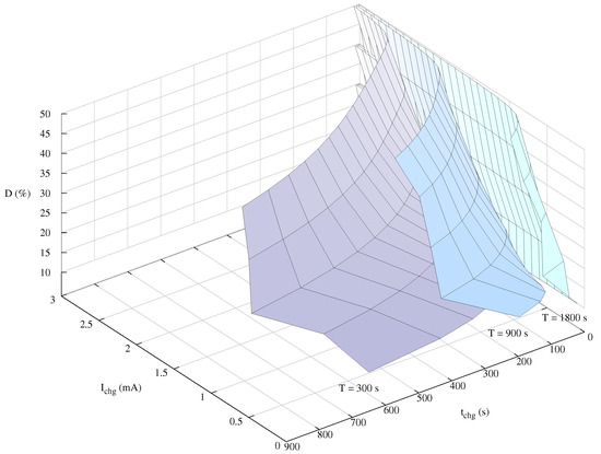 In this Figure 13, the light green curve represents the minimum optimal charging current and time for a given duty cycle when the iteration time of the sensor node is 1800 s, i.e., 30 min. The blue curve shows the same behavior in case of a duty cycle of 15 min (900 s). Finally, the purple surface shows the optimal values for a 300 s iteration time (T = 5 min).