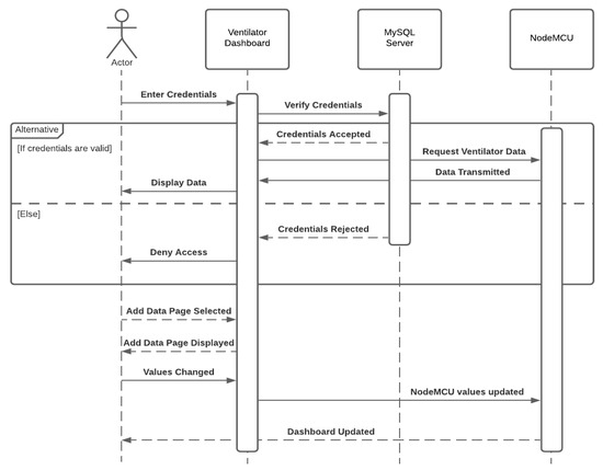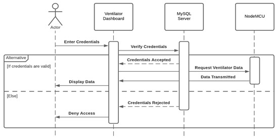If the inserted credentials are approved by the MySQL database, the dashboard will request the NodeMCU microchip asking for the ventilator data. If the credentials are incorrect, access to the dashboard will be denied to the user and no connection is initiated between the dashboard and NodeMCU. An external server is used for storing the approved credentials for the ventilator dashboard.