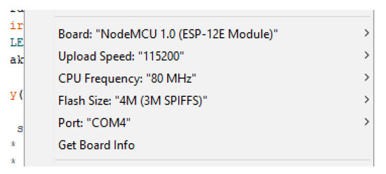 A keyboard, mouse, Micro HDMI to HDMI cable, USB Type-C to USB-A 2.0 cable, and a Micro USB cable were used for providing power to the microchips and uploading code. To upload the C++ ventilator code to the NodeMCU, the settings shown in Figure 4 are used.