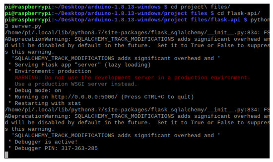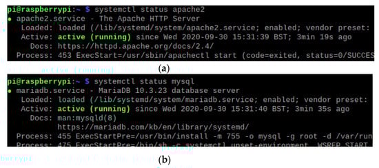 To ensure both the MySQL and Apache2 services are running on the Raspberry Pi the Unix command systemctl status was used. As shown in Figure 8a,b, both services are installed correctly and are active.