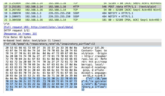 As shown in Figure 11, Wireshark displays the HTTP POST request sent from the ventilator/user interface to the NodeMCU ventilator model. To initiate the POST request, the machine hosting the ventilator dashboard updated the ventilator model controls with new values. These values were then intercepted in transmission using another laptop posing as a malicious actor. A malicious actor can modify these values to adjust how the ventilator model functions. These values are not as frequent on the network and will only be visible when an authorized user updates the ventilator with new values.