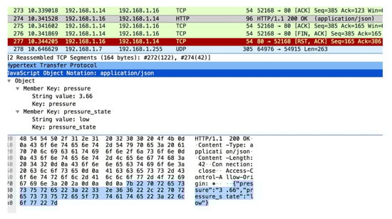 Figure 12 displays the HTTP GET request sent from the adversary dashboard to the NodeMCU ventilator model. This capture requests for the NodeMCU ventilator model to send the sensor data. This data is more persistent on the network as it constantly updates the dashboard with a real-time pressure reading. The air pressure sensor value can be intercepted and modified in flight. Doing so and displaying an incorrect measurement on the dashboard may influence a clinician to update particular ventilator values to account for the counterfeit reading. The updated values could have a detrimental effect on the patient’s lungs and, in the worst-case scenario, could potentially kill the patient.