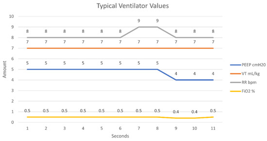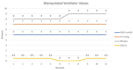 Figure 13 exhibits what the values used in this experiment would typically be set as on an operational ventilator under normal operation (scenario). A malicious actor (adversary) who has successfully eavesdropped onto the network can transmit counterfeit packets to the remote ventilator to adjust its performance. Figure 14 illustrates an attack difficult to notice whereby the rate of FiO2 is set to 0 for a short duration of time. The FiO2 value controls the concentration of oxygen in the ventilator gas mixture. Setting this value at 0 for a brief duration would deprive a patient of their oxygen. This attack carries extreme consequences for a patient and if done subtly, can be undetected by a clinician unless an alarming system is used on the ventilator system to signal such occurrences.