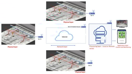 A four-layer IoRT framework [] is used for rodent inspection in a false ceiling environment. It consists of: (1) a physical layer, (2) a network layer, (3) a processing layer, and (4) an application layer. The details of each layer and its operation are described as follows.