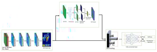 Region Proposal Network (RPN): RPN is a critical component of the Faster RCNN detector framework. It generates the bounding box on the output image using the anchor box approach. Anchor boxes are predetermined boundary boxes with a specific height and width. It detects a variety of objects, including objects of varying sizes and overlapping objects. RPN uses the final feature map of the feature extractor as input and performs a 3 × 3 sliding window operation spatially to generate the anchor boxes and a 512-dimensional feature map. The anchor box’s height and width are determined automatically based on the size of the objects in the training dataset. According to the sliding window’s center point, nine anchor boxes are formed for each sliding window region with three different sizes. An anchor box scheme generates the total anchors, where W and H are the width and height of the feature extraction layer map, respectively, and k is the depth of the feature map. On the output side, the actual position of an anchor box in the original image is determined by decoding the feature map output back to the input image size using the stride 16 functions. It creates a series of tiled anchor boxes. RPN computes two things from the series of tiled anchor boxes: The first factor is the probability that an anchor is an object. The second thing is to execute the bounding box regression to alter the anchor position to be more appropriate for the objects or more comparable to the ground truth. In the end, the Non-Maximum suppression (NMS) algorithm is applied to filter out the overlapping bounding boxes from the generated proposal.