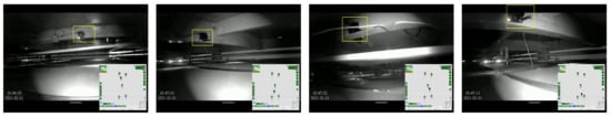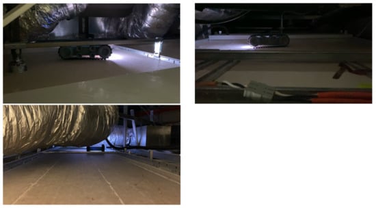 Figure 8 shows the Falcon robot operation in a false ceiling environment. During the inspection, the robot was controlled by 4G LTE-enabled mobile GUI interface and robot positioning was monitored through UWB localization modules fixed in a false ceiling environment. Figure 9 shows some of the Falcon robots collected images with rodent activity signs collected from the SUTD false ceiling. The robot paused in each stage for a few seconds to capture the picture of the false ceiling and forward the remote server via D-Link 4G/LTE mobile router to execute the rodent activity detection.