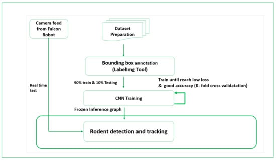 The detection framework has three pre-steps: collecting the dataset (rodent, droppings, and gnaw marks images), labeling the collected images, and training the detection framework with pre-trained weights.
