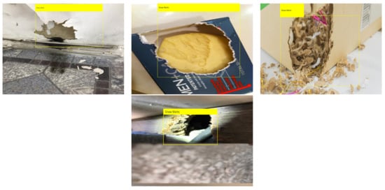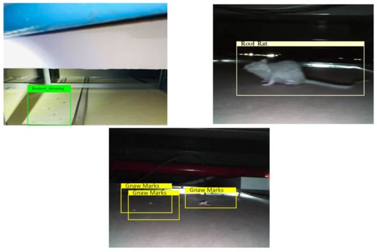 The offline test used rodent sign images (gnaw, scampering, scratching, droppings) and three rodent classes: Norway rats, roof rats, and house mice. One hundred images are used in the offline test for each class. The test images are gathered from various online sources that are not utilized for training the detection framework. Figure 13, Figure 14 and Figure 15 show the experimental results of the offline test. Here, rodent droppings are detected as a gray rectangle box, gnaw marks, scampering, scratching are marked as a yellow rectangle box, and rodent detection is marked as a red, blue, and green rectangle box, respectively. The experimental results show that the algorithm correctly detected gnawing, scampering, scratching, droppings, and three rodent classes, with an average detection confidence level of more than 90%.