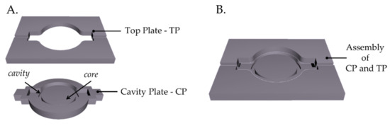 (A) CAD of the Top Plate -TP- and the Cavity Plate -CP-, (B) their assembly.