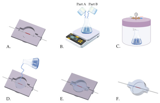 The main manufacturing steps: (A) the FBG sensor positioning, (B) the silicone components mixing, (C) the bubble degassing of the mixture, (D) the mixture pouring, (E) the silicone curing and (F) the soft sensor demolding.
