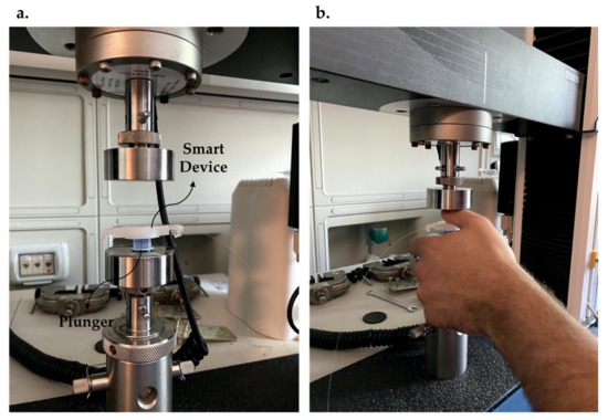 (a) Positioning of the plunger and the smart device on the lower plate of the TM. (b) Volunteer’s thumb applied on the smart device during the compression tests.