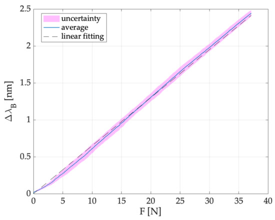 ΔλB vs. F (applied using the TM) of the proposed device. The continuous line in light blue refers to average ΔλB vs. F, the highlighted areas in magenta refer to the uncertainties and the dotted black line shows the linear fitting.