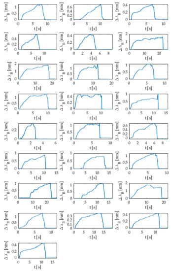 Figure 8 shows the 25 trends (i.e., ΔλB (nm) vs. time (s)) matching the executed experiments.