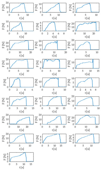 Twenty-five trends (i.e., F (N) vs. t (s)) estimated during the in silico experiments.