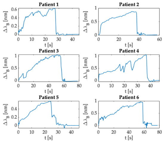 Figure 11 shows the ΔλB trend as a function of time obtained for each epidural procedure performed by the anesthesiologist in enrolled patients. After collecting data, a custom-made algorithm developed in MATLAB® environment allowed data processing. As described in Section 3.1.1, we evaluated the ΔλB recorded during each procedure.