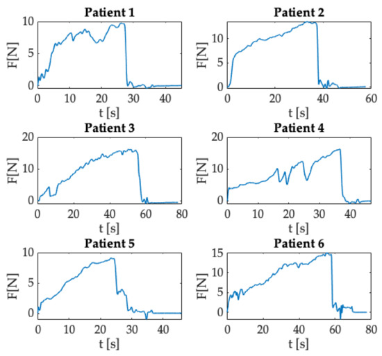 As shown for the results of in silico experiments (Section 3.1.1), from the ΔλB values recorded for all the trials executed on the patients enrolled, we evaluated the force applied by the clinician during the epidural punctures (please refer to Figure 12). In this case, the maximum force values were in the range of 6 N–15 N.