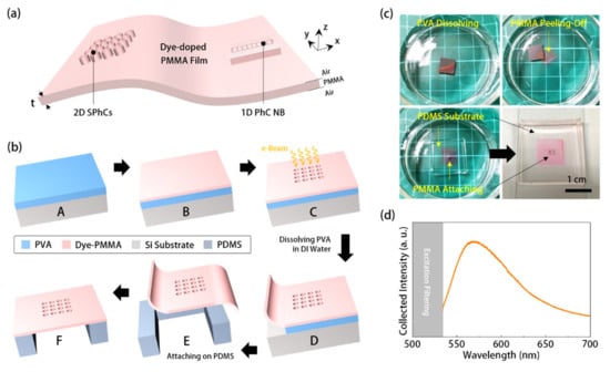Figure 1a shows schematics of the thin-film PhC dye-laser we studied in this report. It includes two kinds of PhC resonators manufactured on a polymeric thin film (with a thickness of t) suspended in the air. The thin film, with a refractive index n of 1.49, is doped with chemical dyes as the gain medium. The PhC resonator design includes two-dimensional (2D) square PhCs (SPhCs) and one-dimensional (1D) PhC nanobeam (NB) cavity. In realizing the above structure, the manufacturing process in Figure 1b started with (Step A) spin-coating a polyvinyl-alcohol (PVA) interlayer (1000 rpm for 60 s, followed by 3000 rpm for 60 s) on a silicon substrate. We prepared the dye-doped polymer by dissolving the chemical dye PM-597 (Exciton Inc.) in poly-methylmethacrylate (PMMA, 950 K) with a concentration of 25 μmol/g. Afterward, we (Step B) spin-coated the dye-doped PMMA onto the PVA layer (1000 rpm for 10 s, followed by 3500 rpm for 25 s), which produced a PMMA layer with a thickness of 300 nm. After soft baking at 90 °C for 180 s, we (Step C) directly defined and manufactured the PhC patterns on the dye-doped PMMA layer by electron beam (e-beam) lithography. Then, in Steps D and E, we immersed the sample in deionized (DI) water to dissolve the PVA interlayer and separate the patterned PMMA thin film from the silicon substrate. Finally, we (Step F) attached the PMMA thin film onto a polydimethylsiloxane (PDMS) substrate with a via-hole to form a thin film structure suspending in the air. This step also means that one can attach this patterned PMMA thin film onto any other suitable surface or objects. The pictures in Figure 1c show the process from Steps D to F. We then excited the dye-doped PMMA thin film using a 532 nm laser at room temperature to confirm its optical emission. The measured photoluminescence (PL) spectrum in Figure 1d shows a broad emission spectral linewidth of about 80 nm centered at 570 nm. Therefore, the thickness of the PMMA thin film (t = 300 nm) was between λ/2n and λ/n, where λ represents the emission peak of dye-doped PMMA thin film. This thickness guaranteed that the PMMA thin film, as a planar waveguide in our proposed structure, only supports a transverse-electric-like (TE-like) fundamental mode.