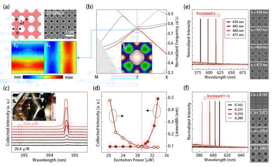 Figure 2a shows the scanning electron microscope (SEM) image of the 2D SPhCs on a dye-doped PMMA, manufactured by the process in Figure 1b, which is within an area of 50a × 50a. We excited it by using a 532 nm laser pulse with a pulse width of 0.5 ns, a repetition rate of 1 kHz, and a spot size of 8 μm in diameter, at room temperature. Figure 2c and its inset show the measured spectra under excitation powers from 20.4 to 33.6 μW and the picture of light emission (the orange light spot) from the dye-doped PMMA film with 2D SPhCs under excitation. Figure 2d further shows the collected power (light-in-light-out (L-L) curve) and spectral linewidth variations of the optical emissions of the 2D SPhCs under different excitation powers. The curves’ bending clearly indicate the lasing action with a threshold of 29 μW. To prove this lasing action comes from the Γ1 BE mode, instead of the dye itself, we further characterized the emissions from 2D SPhCs with different lattice parameters. In Figure 2e, for the 2D SPhCs with a fixed r/a of 0.26 and increased a from 430 to 475 nm, the lasing wavelengths showed significant red shifting. Furthermore, in Figure 2f, with a fixed a of 445 nm, the lasing wavelengths of 2D SPhCs showed a blue shifting when the r/a increased from 0.165 to 0.28. These wavelength shifts, caused by different lattice parameters, are the features of photonic modes in PhCs. It thus confirms the laser emissions come from the Γ1 BE mode in 2D SPhCs.