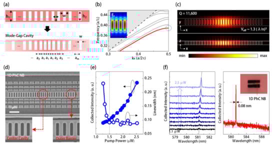 - Quan, Q.; Burgess, I.B.; Tang, S.K.Y.; Floyd, D.L.; Loncar, M. High-Q, low index-contrast polymeric photonic crystal nanobeam cavities. Opt. Express 2011, 19, 22191–22197. [Google Scholar] [CrossRef] [PubMed] [Green Version]