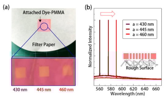 In addition to a low-cost visible laser, the single-mode lasing action and narrow spectral linewidth are also beneficial for providing a sufficient S/N ratio and spectral resolution in optical sensing applications. Owing to the elastic thin film structure, the PhC dye-lasers presented herein could further be used as a strain sensor, capable of on-demand attachment to analyzed object surfaces. To confirm the feasibility of this idea, we first investigated the lasing properties of the PhC dye-lasers after attaching them to an object’s surface. In the manufacturing process, we separated the dye-doped PMMA thin film from the silicon substrate and attached it to filter paper in DI water. The picture and OM image in Figure 4a show the dye-doped PMMA thin film with the 2D SPhCs with different lattice constants on filter paper. In measurements, the attached 2D SPhC dye-lasers retain almost the same lasing wavelength in the case of suspending it in the air, as shown in Figure 4b. These invariant wavelengths come from attaching to a surface with roughness much larger than the wavelength scale, which makes the 2D SPhCs equivalent to suspension in the air, as illustrated by the inset of Figure 4b. The lasing wavelength also showed the same trend of increasing with the lattice constant. Therefore, we confirmed our presented PhC dye-lasers were still workable when attached to the analyzed object surface, particularly to a surface with a roughness larger than λ. In addition, it of note that this thin film with PhC dye-lasers can be transferred to the other object’s surface by merely repeating the above-attaching process in water, which means it has reusability when serving as an attachable strain sensor.