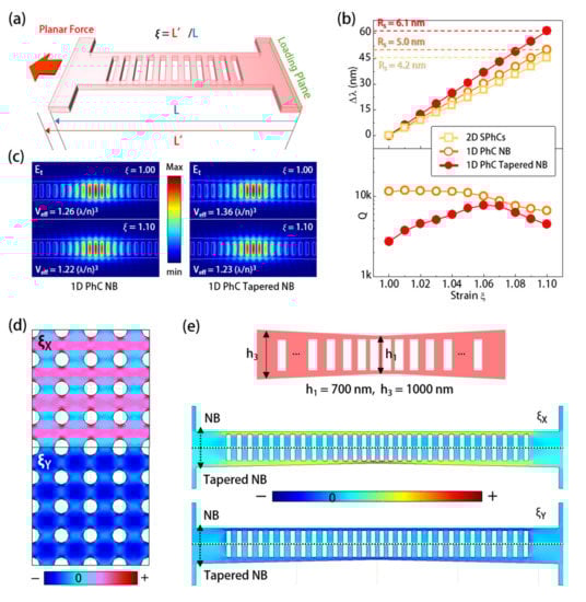 - Lu, T.W.; Wang, L.C.; Lai, C.H.; Lee, P.T. Strain shapes the light in a photonic crystal nanocavity. Photon. Res. 2020, 8, 24–31. [Google Scholar] [CrossRef]