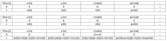 Having a set of tables, as described in the previous paragraph, and using the linear interpolation, we can determine the tables for the starting conditions corresponding to intermediate angular speed values or the intermediate rudder setting values. If the table for the starting conditions are to correspond simultaneously to both intermediate angular speed and rudder setting values, two-line interpolation should be used. Using linear interpolation, Figure 3 shows the method of determining an example row of the table for the starting conditions corresponding to an intermediate value of angular speed r when the tables are given for starting conditions corresponding to the angular speed values of r1 and r2 .
