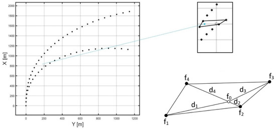 The proposed weighted average interpolates the values of the individual parameters of the ship’s state vector in such a way that the weight of the measurement becomes higher as the distance between the point set for interpolation, and the node becomes shorter. In the case illustrated in Figure 4, the highest value will be obtained by the weight that corresponds to the measurement .