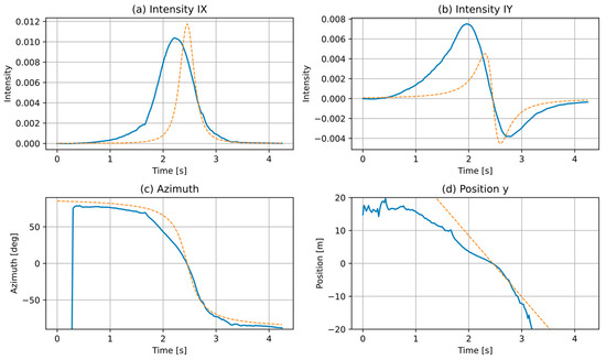 Figure 2 presents the intensity in X-Y directions, the azimuth, and the estimated position, computed from recorded signals of a passenger car, passing by the sensor at an approximately constant speed of 66.9 km/h (18.6 m/s), ca. 3.8 m from the sensor, from left to right. These plots are compared with an ideal point source moving at the same speed and distance from the sensor. Differences are clearly visible. Sound intensity plot in the perpendicular direction (IX) for a real vehicle is shifted back in time (precedes the point source) and the plot of intensity in parallel direction (IY) is asymmetrical, with more weight on the left of the zero-crossing point. This indicates that the vehicle propagates most of the sound energy towards the front of the vehicle, mainly due to a horn effect [30]. The azimuth plot of the vehicle also deviates from the point source, and the position plot shows even larger differences compared with a linear plot of the point source, for the reasons described earlier in this Section. It should be also noted that when the vehicle is far away from the sensor, signal-to-noise ratio becomes very low and the azimuth and the position are not measurable. Therefore, only a short section of the signal (near the zero azimuth point) is usable for analysis.