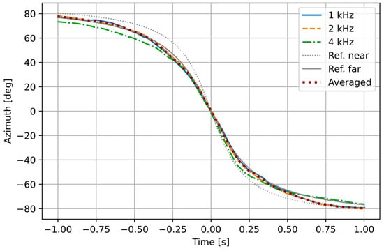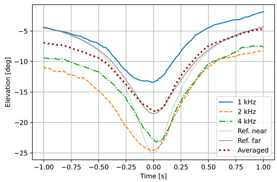 It is our assumption that with this approach, we obtain a distance to the point situated near the tires further from the sensor, approximately at the half of distance between the front and the rear tire, and that this point remains constant relative to the vehicle when the source is observed within the azimuth range used for the measurements (about −45 to 45 degrees). In order to verify this assumption, we performed the following experiment. Several passes of vehicles moving at a constant speed were recorded with the AVS. A certified lidar-based device (Vitronic Poliscan) was used to measure the vehicle speed and to determine the position of two edge points at the front of vehicle’s body, called a near and a far reference point. Based on these measurements, movement of two reference points was estimated using a point source model presented earlier and compared with the sound intensity signals computed for the vehicle, in three frequency bands. The obtained azimuth and elevation signals for a single vehicle are shown in Figure 3 and Figure 4. The results of azimuth measurement in the 1 kHz and 2 kHz bands mostly overlap with each other and with the modelled far reference point. The 4 kHz band values deviate from the other bands as the azimuth increases, as expected. From the elevation plot it may be observed that at the zero azimuth, the 4 kHz value indicates a point consistent with the near reference point, while the 1 kHz point is well beyond the vehicle (larger negative elevation means that the point is closer to the sensor). However, for larger absolute azimuth values, the source projection in the 1 kHz band moves closer to the far reference, while the 4 kHz band values indicate a position before the vehicle. The values in the 2 kHz band are inconclusive. Analysis of elevation is required only in a short time window around the zero-azimuth point (±0.1 s), and the average of results from the 1 kHz and 4 kHz bands follows the modelled movement of the far reference point within this time frame. Therefore, the assumption stated earlier is confirmed for the far reference point as the tracked source.