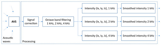 The correction functions were obtained by means of the calibration procedure, performed in an anechoic chamber. One amplitude correction function for each pressure signal (each microphone) and one phase correction function for each axis (each acoustic velocity signal) were calculated [29]. The correction was applied to the signals during the calculations, using finite impulse response digital filters of length 512. Instantaneous sound intensity on each axis was calculated using Equations (1)–(3), and then averaged in non-overlapping windows of 256 samples. The resulting time-averaged intensity signals were sampled uniformly at 187.5 Hz (temporal resolution 5.33 ms).