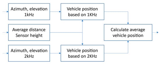 The method presented here computes the position signal for a single vehicle. Procedure for calculation of intensity signals from pressure signals provided by the AVS is presented in Figure 5. In this paper, we assume that the pressure signals are discrete and uniformly sampled. The pre-processing stage performs amplitude and phase equalization of the pressure signals to minimize differences between the transfer functions of microphones that would contribute to errors in sound intensity measurements [29]. Next, signal sections that represent individual vehicles are determined by analysis of the intensity and azimuth functions [14]. For each vehicle, sound intensity in three axes, as well as azimuth and elevation functions, are calculated in three octave bands (1 kHz, 2 kHz, and 4 kHz). The results are then used to calculate the position of the vehicle, using the previously presented method.