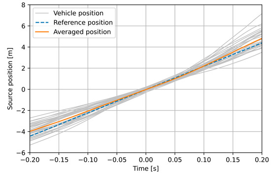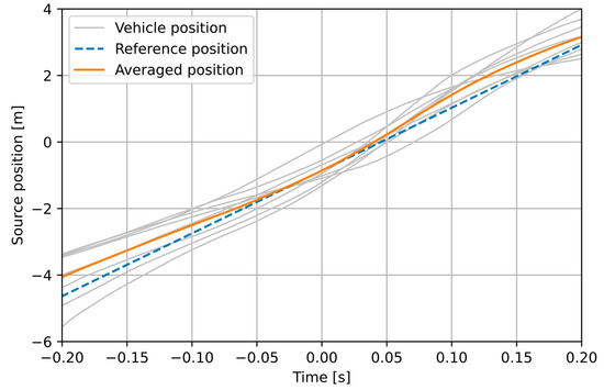 Figure 12 and Figure 13 illustrate how the proposed method of time-averaged traffic speed estimation works. The following signals are shown: positions of the individual vehicles, the averaged position signal, and the position of a modelled point source, moving at a speed equal to the average speed of all vehicles (measured with the reference device). In the experiment M (Figure 12), the drivers attempted to move at a constant speed. This is reflected in position signals that are approximately linear, changes in the slope are mainly due to variations in distance. The averaged position signal is mostly aligned with the reference, although it deviates from it with the increasing distance from the sensor (but outside the analysis window used by the method). For the second experiment (L1; the remaining L experiments yielded similar results and they are not shown to avoid redundancy), much larger nonlinearity is observed in the position of individual vehicles. In this case, uncontrolled traffic was recorded, and the vehicles moved with varying speed and distance. The averaged position signal is also noticeably non-linear. Nevertheless, the linear regression applied to the average position provides a result that is reasonably consistent with the reference.