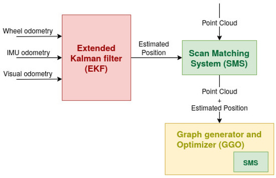 - A Scan Matching System (SMS). This block takes an estimated position as the input and improves it due to point clouds recorded at the same time as the position estimation. The methodology is implemented throughout the algorithm ICP (iterative closest point); however, other methods of 3D registration may be implemented. SMS, as well as EKF, works in open chain, and thus a chain closer should be implemented.