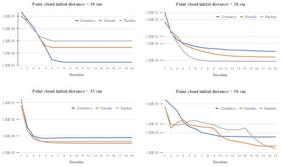 Key-point selection has a great impact on the speed and convergence of the algorithm. Among the sampling methods, it is possible to highlight uniform sampling [36], random sampling [37], normal space sampling [38], and covariance sampling [39]. Figure 2 shows a comparison between the different methods, with the peculiarity that the uniform and random methods provided very similar results and, thus, were condensed together.