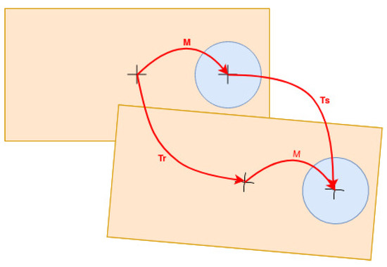 Thus far, a vector of robot positions and point clouds are available. Offline, a developed software produces data in iterations, with N as the number of robot positions and point clouds. This data consists of (a) the transformation between two consecutive robot positions, , and (b) the transformation between two consecutive point clouds due to the SMS, . Both transformations help when the desired transformation between the robot and the LIDAR, M, is calculated, as shown in Figure 5, through the Equation (1).