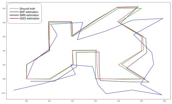 The first tests were carried out in small environments with the RGBd camera D415 by RealSense. The results in one dimension (following a line) showed good performance even though the wheel odometry was inaccurate. The result in two dimensions (2D), shown in Figure 6, include the following details: (a) the pose estimation by EKF, denotes as a blue line, is separated from the ground truth line due to the cumulative errors; (b) the SMS output generated a good output; however, this signal accumulated errors that must be corrected; and (c) the GGO output followed faithfully the ground truth trajectory since the accumulative errors of the scan matching were reduced. In order to test the good performance of the system, a zigzag trajectory was followed by the robot, starting and finishing in the same point. The results showed good behaviour of the loop closure when the robot returned to previous poses and good behaviour when a known position was reached, thereby, correcting the followed trajectory.